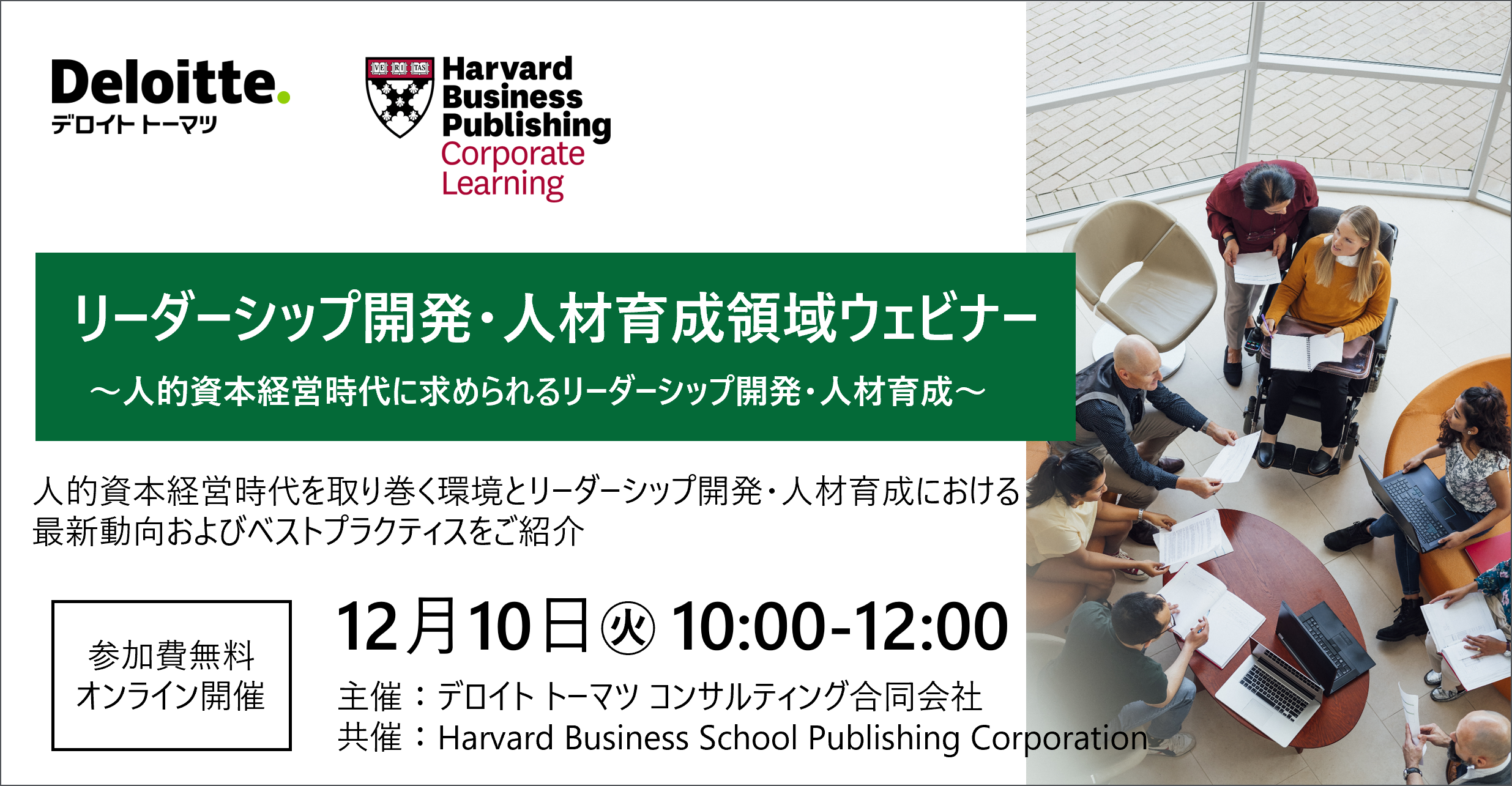 | 内容 | 10:00〜11:00 Turning Potential into Success Harvard Business School Claudio Fernandez-Araoz 11:00〜11:30 人的資本経営時代を取り巻く環境とリーダーシップ開発・人材育成の重要性 デロイト トーマツ コンサルティング合同会社 ディレクター 嶋田 聰 11:30〜12:00 リーダーシップ開発・人材育成ツール (Harvard ManageMentor) の紹介 Harvard Business Publishing Regional Director Perdeep Kumar ※講演テーマ・講師は変更となる場合がございます。予めご了承ください。 ※本セミナーは英語での講演となり、同時通訳のご用意があります。 |