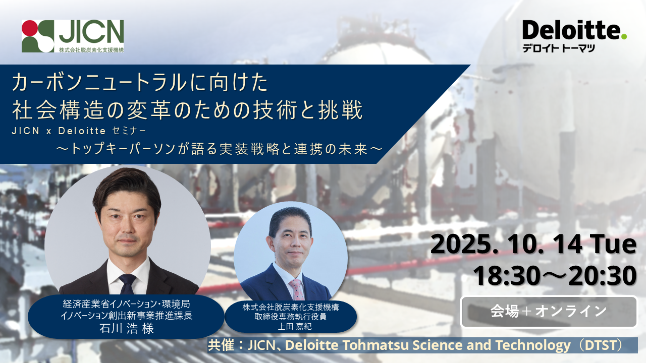 内容 | ■18:30-18:35 はじめに 株式会社脱炭素化支援機構(JICN) 取締役専務執行役員 上田 嘉紀 ■18:35-18:55 基調講演 経済産業省 イノベーション・環境局 イノベーション創出新事業推進課長 石川 浩氏 ■18:55-19:15 社会実装のグラデーション:TRL×ARLで読み解くスタートアップの現実 株式会社脱炭素化支援機構(JICN) 取締役専務執行役員 上田 嘉紀氏 ■19:15-19:35 カーボンニュートラル技術リスト第7弾 紹介 Deloitte Tohmatsu Science and Technology デロイト トーマツ リスクアドバイザリー合同会社 秋本 佳希 デロイト トーマツ コンサルティング合同会社 杉山 貴志 ■19:35-19:55 質疑応答 ■19:55-20:00 閉会(Webinar配信終了) Deloitte Tohmatsu Science and Technology デロイト トーマツ リスクアドバイザリー合同会社 齋藤 晃太郎 ■20:00-20:30 質疑応答・意見交換会(会場のみ) ■登壇者情報 経済産業省 イノベーション環境局 イノベーション創出新事業推進課長 石川 浩氏 <略歴> 経済産業省入省後、イノベーション政策、エネルギー政策、自動車政策などを担当後、西村康稔新型コロナ対応・経済再生担当大臣秘書官、産業構造課長、大臣官房参事(アジア太平洋州総括)などを経て、2025年7月よりイノベーション創出新事業推進課長。東京大学教養学部国際関係論分科、カーネギーメロン大学大学院(MBA)卒。 株式会社脱炭素化支援機構(JICN) 取締役専務執行役員 上田 嘉紀 <略歴> 1995年京都大学大学院工学研究科修士課程修了。関西電力入社後、原子力発電・原子燃料調達、エネルギー関連の新規事業開発、気候変動・電力システム改革の政策対応、DX戦略立案等に従事。スタンフォード大学客員研究員、シリコンバレーのVCやK4 Venturesにて、通信・エネルギー・eモビリティ・宇宙などのスタートアップ投資に従事。2022年10月、関西電力を退職し、現職にてカーボンニュートラル関連投資を統括。東京大学公共政策大学院客員研究員、文部科学省SBIRフェーズ3(宇宙(輸送)) 採択審査委員会 副委員長/ステージゲート審査委員会 委員長、JAXA宇宙戦略基金 宇宙輸送(将来輸送に向けた地上系基盤技術) 審査委員会 委員。原子炉主任技術者、米国公認会計士、中小企業診断士他。 Deloitte Tohmatsu Science and Technology(DTST) デロイト トーマツ リスクアドバイザリー合同会社 マネージングディレクター 齋藤 晃太郎 <略歴> 大手電器メーカー、エネルギーシンクタンク、環境コンサルティングファーム等を経て監査法人トーマツ入社。省エネ・再エネ・脱炭素対策等エネルギー政策実行支援、環境・脱炭素対策技術関連調査・FS、資源エネルギー投融資における環境・社会デュー・ディリジェンス等多岐にわたる実績を有する。またDeloitte Tohmatsu Science and Technologyのカーボンニュートラルチームをリードしカーボンニュートラル社会を見据えた技術ソリューションリストを作成展開し、中央省庁、自治体、民間企業等へのコンサルティングに従事している。 デロイト トーマツ コンサルティング合同会社 シニアマネジャー 杉山 貴志 <略歴> 総合電機メーカーの知財部門にて10年以上にわたり新規事業を中心とした知財戦略の企画・実行、M&Aなどに従事。日本知的財産協会における専門委員会の活動を4年程度実施し、東南アジアや中東地域等の知財制度を調査。コンサルティングファームにおいては、主にGX領域における技術の社会実装支援をテーマに、技術インテリジェンス・知財といった領域において、事業会社における新規事業検討や官公庁における政策検討支援を多数リード。特にスタートアップ関連ではスタートアップ企業に対する知財戦略の立案・実行支援やベンチャーキャピタル側からのソーシング支援等を多面的に推進。社会実装の担い手である企業側の新規事業検討の経験を活かし、より解像度を高めた戦略立案〜実行支援を得意とする。主な資格:弁理士・中小企業診断士 デロイト トーマツ リスクアドバイザリー合同会社 シニアマネジャー 秋本 佳希 <略歴> 総合化学メーカーにてエンジニアとして化学プラントの設計、運転管理、設備・運転の改善策の企画・実行、コスト削減などに約6年間従事。2017年にトーマツに入所後は、主には気候変動・カーボンニュートラル対策の領域において、民間企業、自治体、官公庁向けに、GHG削減計画の策定支援・GHG削減効果の算定・分析やカーボンニュートラル関連技術の事業化に向けたFSや実証の支援などの領域で実績を有しており、技術職バックグラウンドを活かし技術の社会実装支援関連の業務に従事。また、『2050年カーボンニュートラルの実現に向けた技術リスト』の作成を担当。主な資格:エネルギー管理士(熱)、高圧ガス保安責任者(甲種化学、第一種冷凍) ※講演テーマ・講師は変更となる場合がございます。予めご了承ください。 |