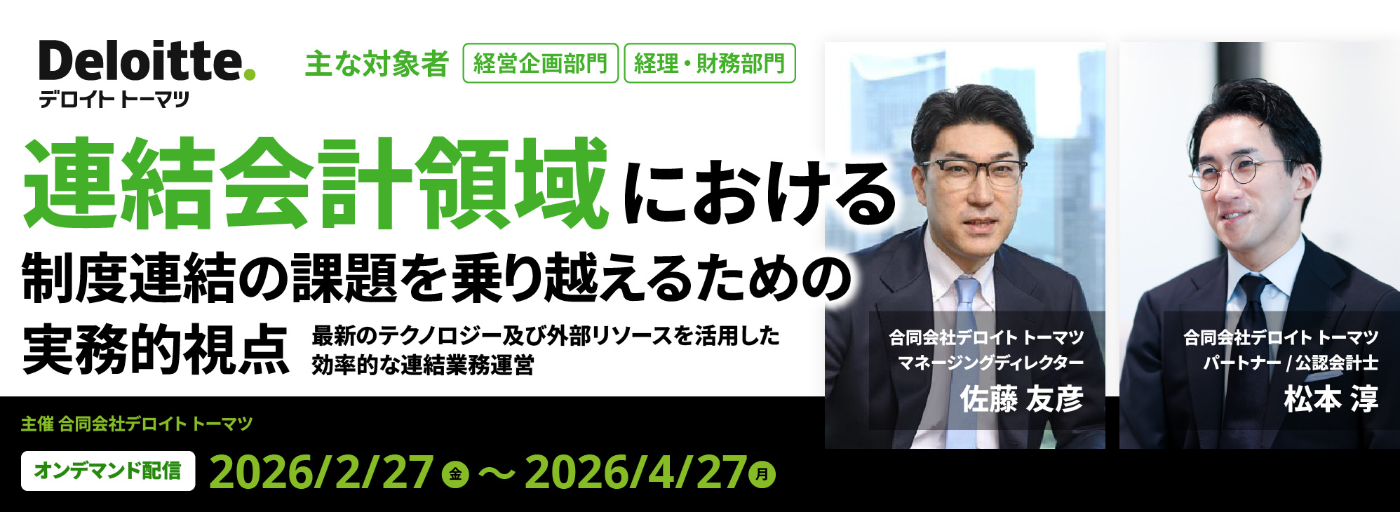 | 内容 | 約10分 ・オープニング ・連結グループ経営の発展と求められる期待の変化 合同会社デロイト トーマツ アカウンティング&ファイナンス マネージングディレクター 佐藤 友彦 約15分 ・各連結会計領域の目的と課題 ・主要な課題事例と3つの施策 合同会社デロイト トーマツ アカウンティング&ファイナンス マネージングディレクター 佐藤 友彦 約5分 クロージング 合同会社デロイト トーマツ アカウンティング&ファイナンス パートナー/公認会計士 松本 淳 (合計:約30分) |