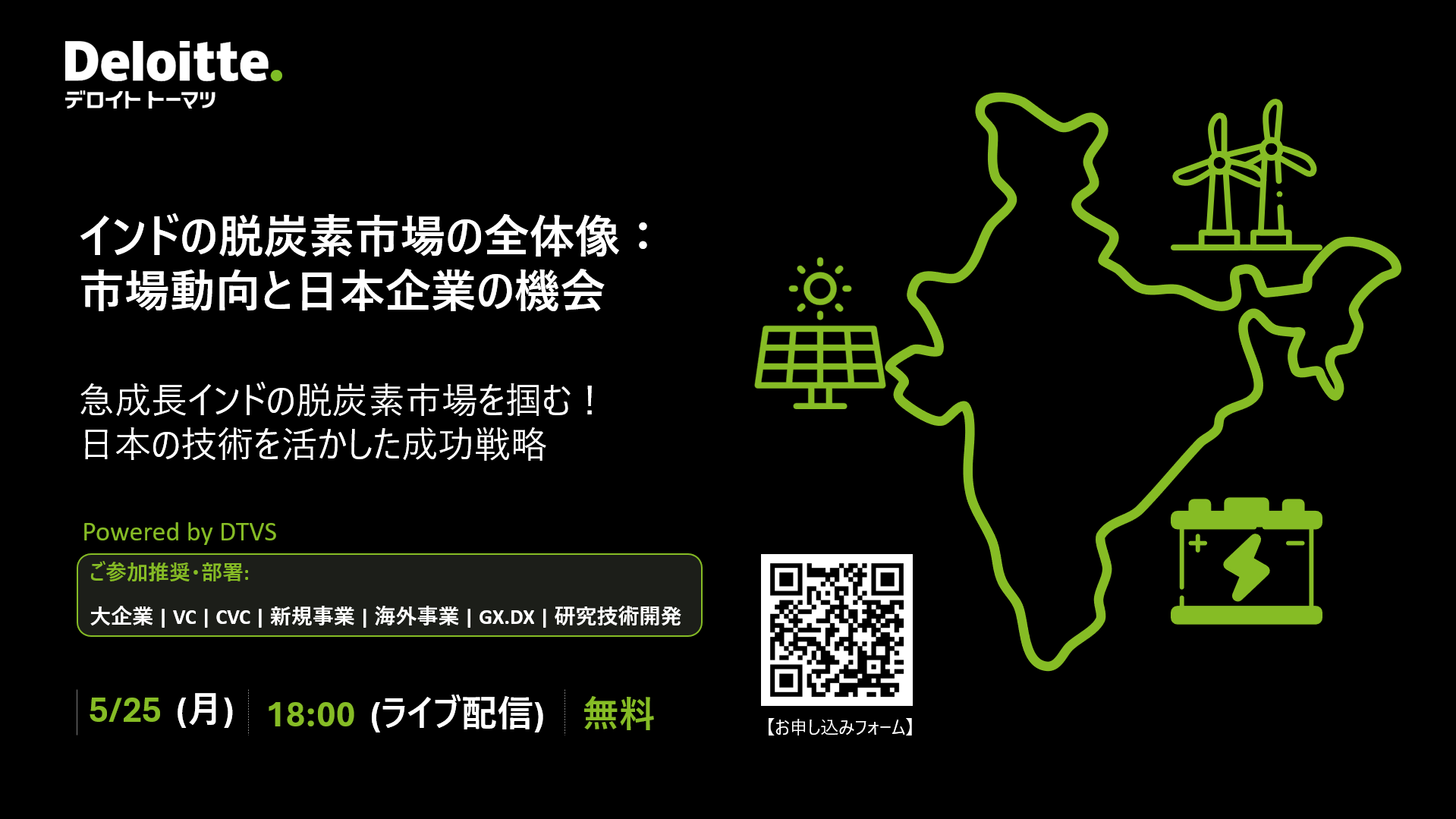 経済成長著しいインドでは、政府の野心的な目標のもと、巨大な脱炭素市場が生まれつつあり、またスタートアップを含む脱炭素イノベーションエコシステムが急速に形成されて来ています。本Webinarでは、その全体像を解説するとともに、日本の優れた技術を持つ企業がこの好機を捉え、現地での市場開拓、新事業開発、スタートアップ投資等を成功させるための潜在的な参入オポチュニティと戦略を提言します。